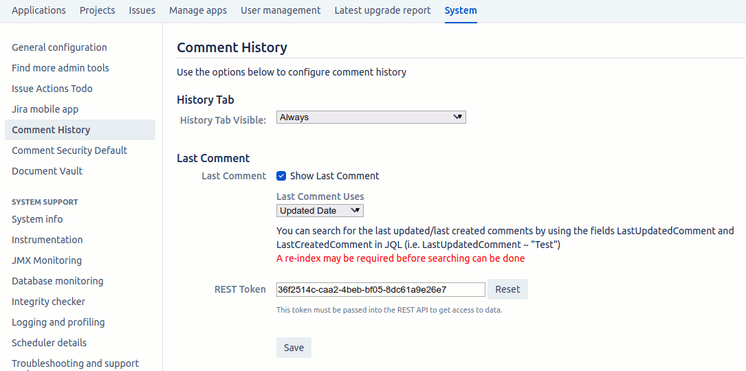 Configuration for Comment History is found in the admin “System” section, “Comment History” (in the top sub-menu section). This screen allows you to configure the visibility of the history tab and the displaying of last comment.