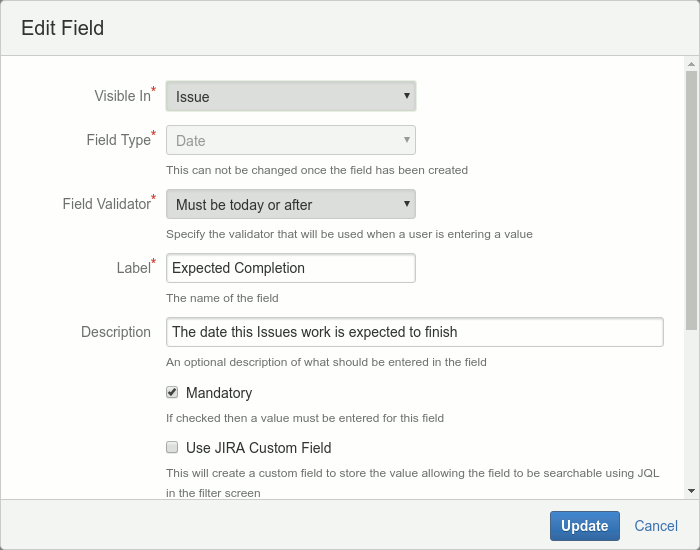 If the “Use JIRA Custom Field” option is checked then the value of a field will also be stored in a JIRA Custom Field. This allows the field value to be displayed and searched for in the Issue Navigator using JQL. The JIRA Custom Field is not displayed in the Issue, New Issue or Edit Issue screens. The value in the JIRA Custom Field should NOT be edited as this is only a copy of the fields actual value.