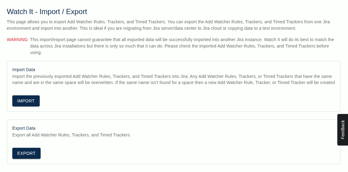 The image below shows the Import/Export page in the Watch It configuration section of Jira cloud. Jira data center is similar, but only has the export option